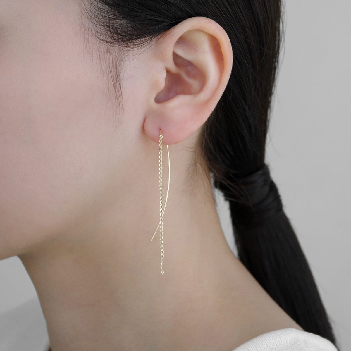 表情の異なる2種類のチェーンが耳元でキラキラと揺れる、ピアス。
