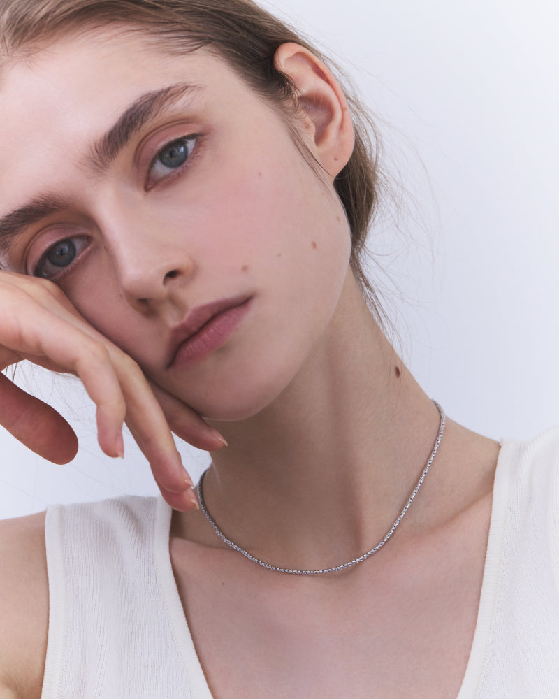 一般的なロープチェーンとはひと味違ったモードな印象のネックレス。