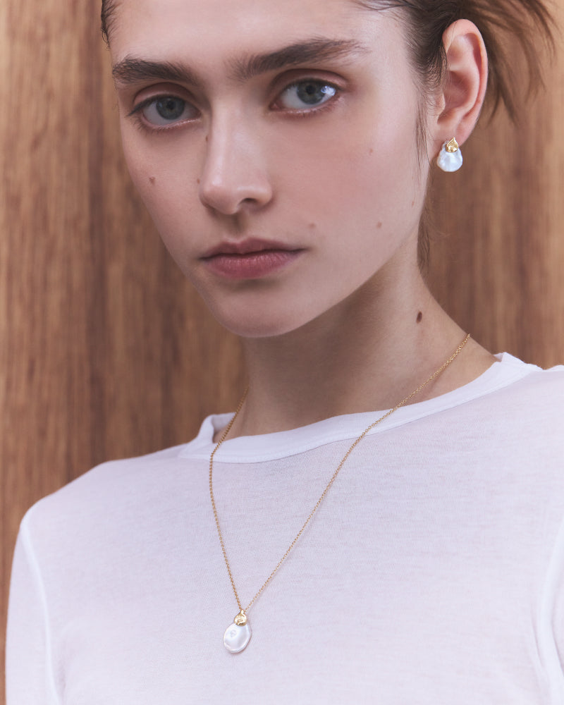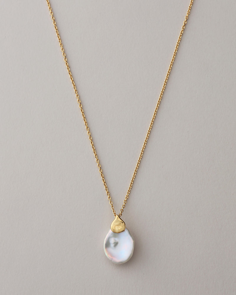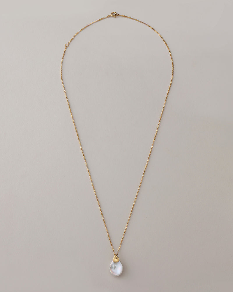 光を受けて優しく艶めくパールが胸元にさりげない華やかさを添えてくれるアイテムです。
